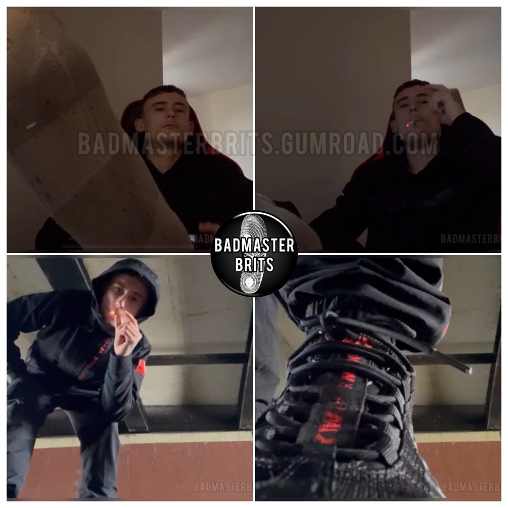 First he is at home smoking and spitting in a glass whilst gaming. Later he is outside smoking and spitting in the street. Looking great in his trackies!